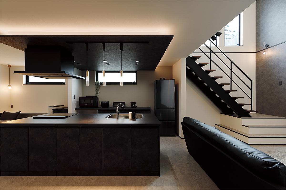 2階のLDKは、天井高を活かした開放感と、アイアン手すりやブラックキッチンで落ち着いたトーンでまとめ、ホテルライクな空間を演出。